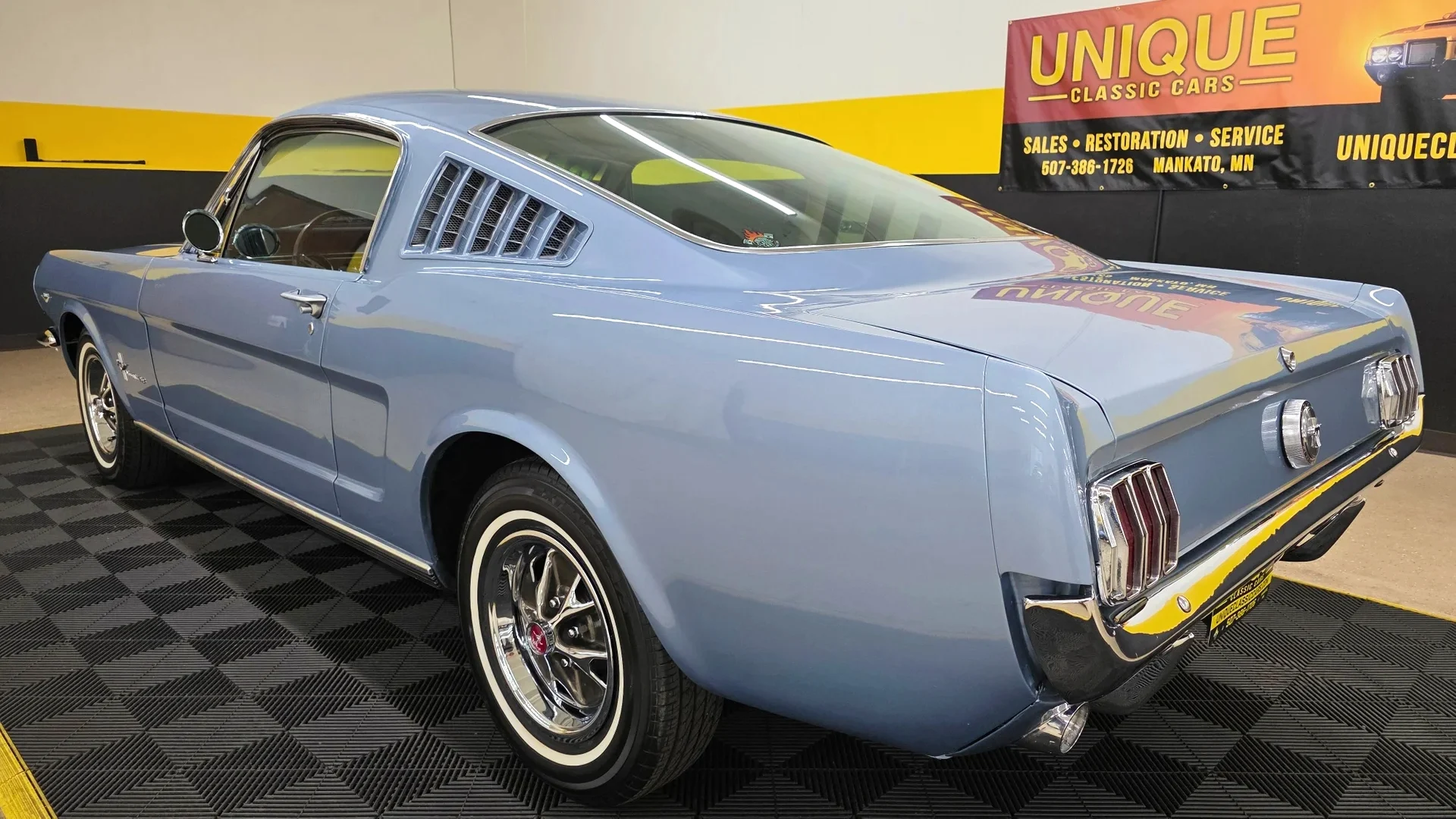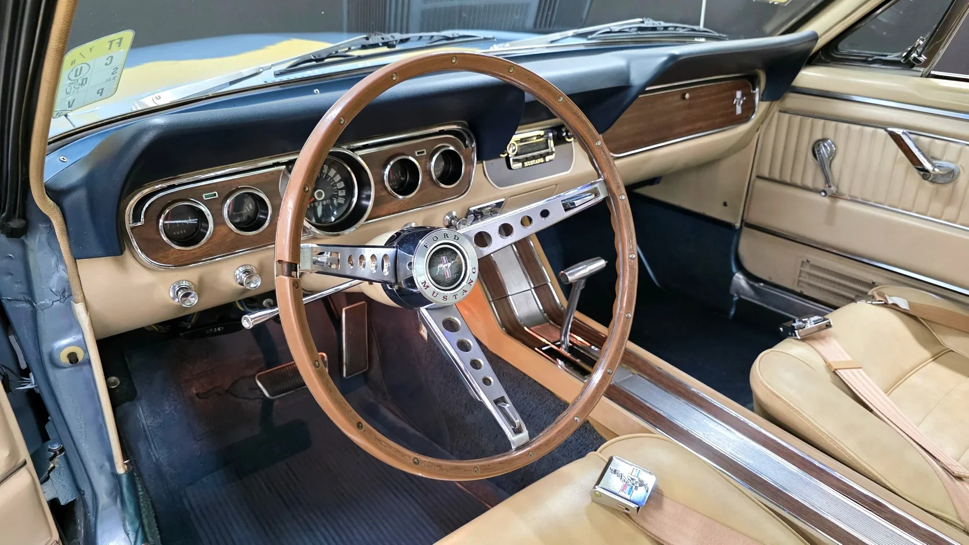 The interior looks to be in good shape with the Parchment Pony seats in nice condition, and the combination of the contrasting blue carpet looks great. A nice addition is the Bluetooth-compatible retro-styled radio, an option that makes this car very usable as a driver.