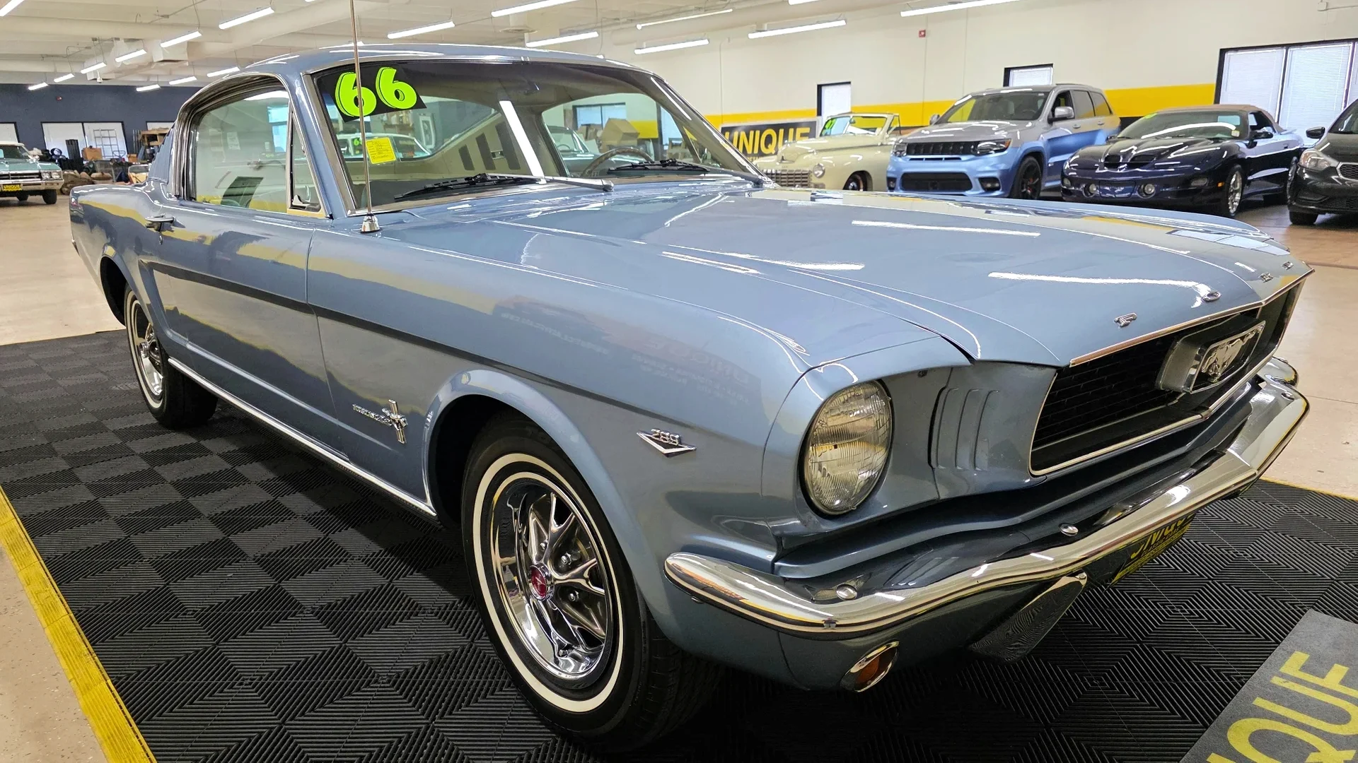 The seller describes this 1966 Mustang Fastback as being powered by a 289ci V8 mated to a three-speed Cruise-O-Matic automatic transmission. Finished in Silver Blue over a Parchment “Pony” vinyl interior, this classic fastback is offered by the selling dealer with a clear title.