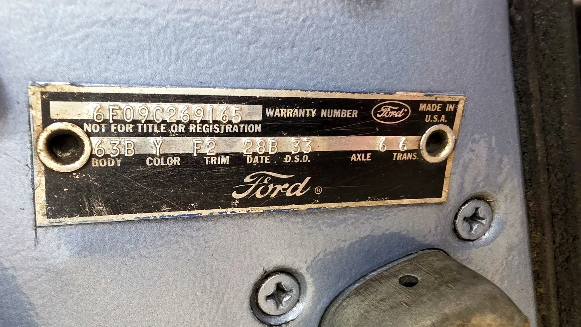 What I like about this car is that while it is not in show condition, it has not been changed from the day it was built. Decoding the data plate reveals this car was built as BODY-63B (fastback with luxury interior), COLOR-Y (Silver Blue paint), TRIM-F2 (Parchment with blue trim luxury upholstery), AXLE- 6 (2.80 gears with standard differential), and TRANS-6 (three-speed C4 automatic).