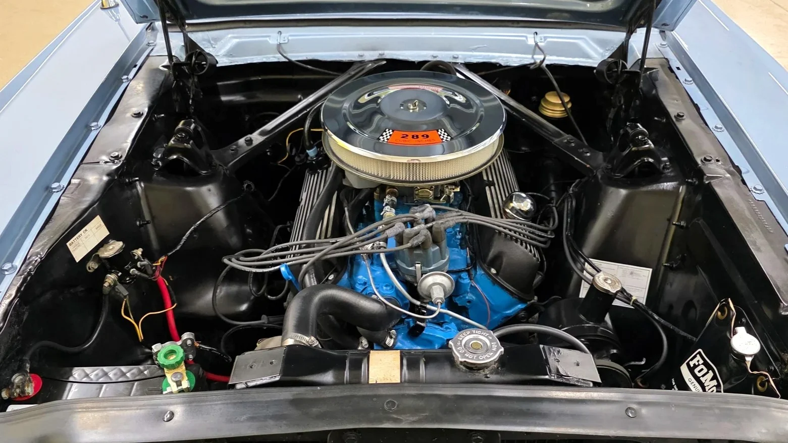 Under the hood is a tidy engine compartment housing a Ford 289ci V8 with a four-barrel carb. The only real modification I could see in the photos were the aluminum valve covers. Everything else looks stock and in very tidy condition.
