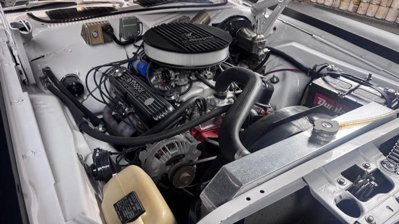 The original 318 has been replaced by a 360 crate engine, which features an Edelbrock intake and four-barrel carburetor, Mopar Performance valve covers and air cleaner, headers, and aluminum radiator. The engine is shifted by a four-speed manual transmission.