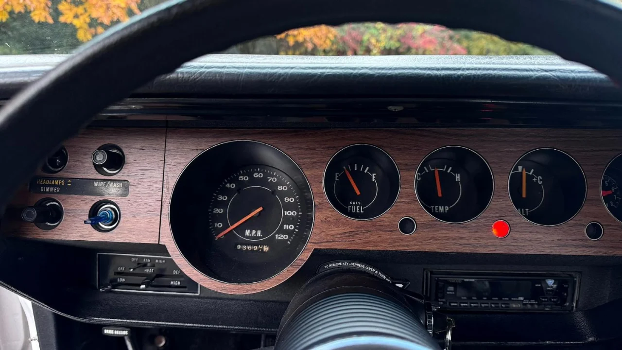 This Barracuda features the standard instrument cluster, which includes 120-mph speedometer and gauges for temperature, alternator, and fuel, plus a clock. The odometer shows 93,691 miles, though the true mileage is unknown.