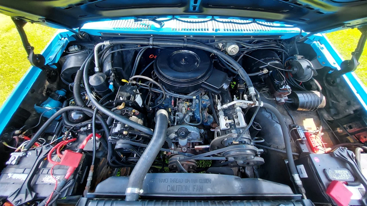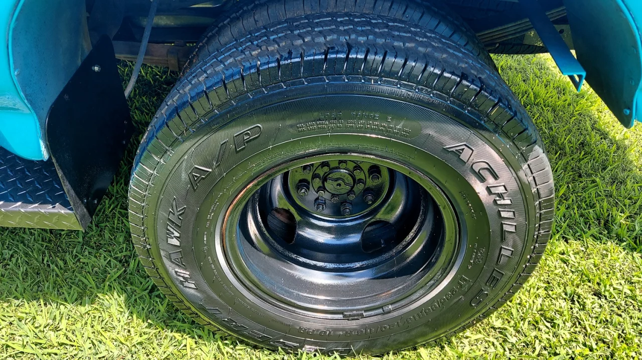 The cabin was retrofitted with blue vinyl upholstery with black piping under current ownership. In addition, the door panels were refurbished and the dash cap was replaced. Other features include power windows and locks, wood trim, cruise control, power steering, air conditioning, Tekonsha Prodigy P3 trailer brake controller, and JVC AM/FM/Bluetooth stereo.