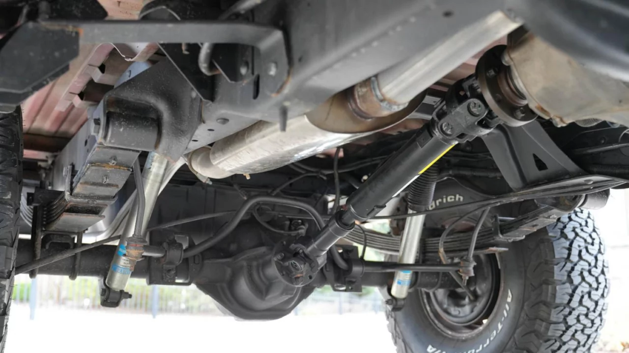 The undercarriage features STEEL-IT undercoating. On the mechanical side, you’ll also find a four-inch lift kit, Bilstein 5100 shock absorbers, and Yukon rear end with MAG-HYTEC differential cover and 4.56 gears. A single exhaust outlet routes emissions behind the right-side rear wheel.