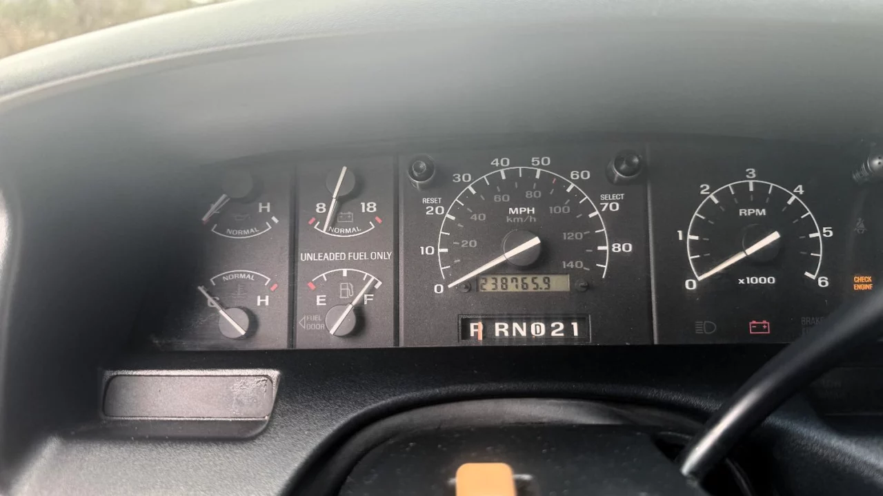 Instrumentation consists of an 85-mph speedometer, 6,000-rpm tachometer, and gauges for the oil pressure, temperature, voltage, and fuel. The odometer currently shows 238,765 miles, though the title reads mileage-exempt.