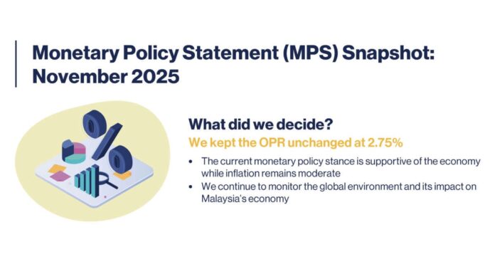 The overnight policy rate (OPR) remains at 2.75% following Bank Negara Malaysia’s (BNM) monetary policy committee (MPC) meeting held on November 6, 2025. This rate has been in place since July when BNM reduced it from 3% previously, and it didn’t change after a prior MPC meeting on September 4, 2025.