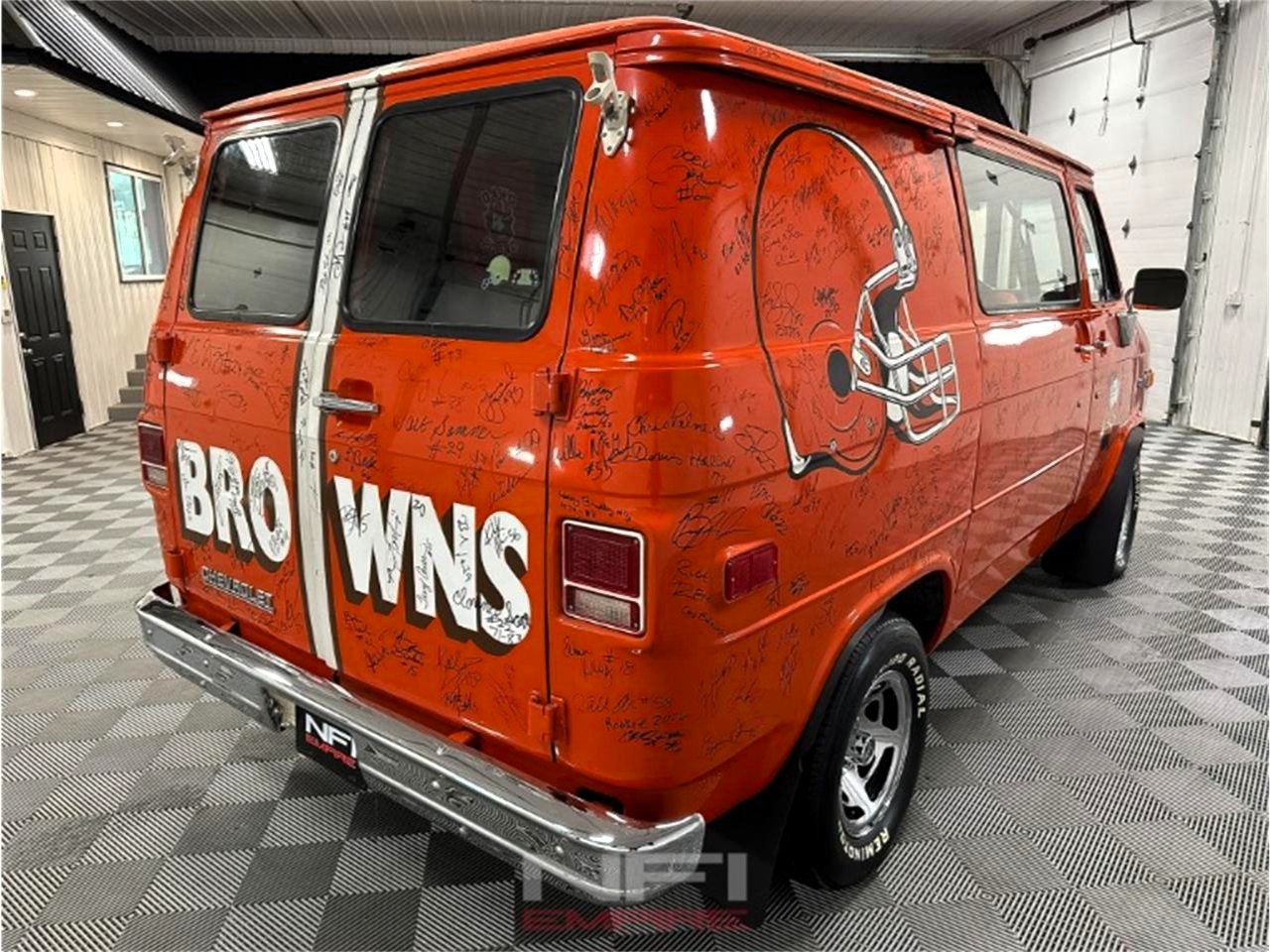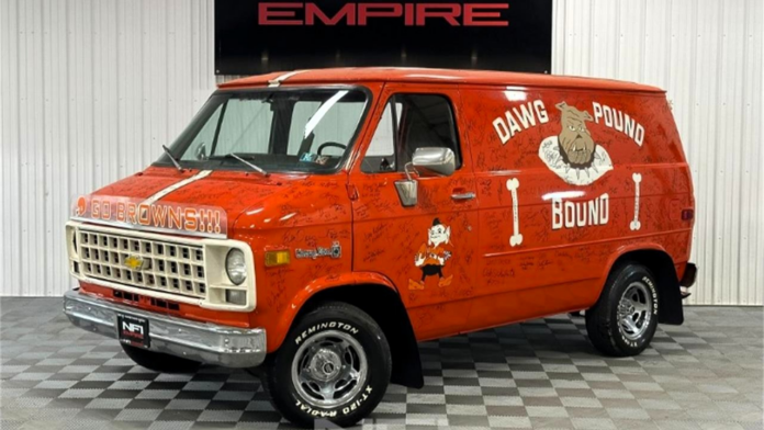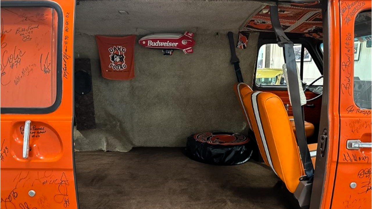 The custom van spirit is demonstrated by this 1982 Chevrolet G10 van. As the lightest-duty van in the Chevrolet roster, it was available in 110- or 125-inch wheelbase. This one appears to be the former, a Chevy Van for the working man (and woman) versus the consumer-friendly Sport Van suited for families and comfort. In addition, this van features the standard powertrain configuration: a 120-horsepower 4.1-liter V-6 backed by a three-speed on the column. Yet the attraction to this vehicle is a bit more profound because this van has been transformed into the spirit of the 1970s — it’s now the Dawg Pound-bound van dedicated to the Cleveland Browns football team. In case you’re not in-the-know, the Dawg Pound is a fan section of Huntington Bank Field where loyalists wear dog masks and bark in support of the team. In addition, the van has been signed by “hundreds” of Cleveland Brown Hall of Famers and team legends (including Jim Brown, natch!).