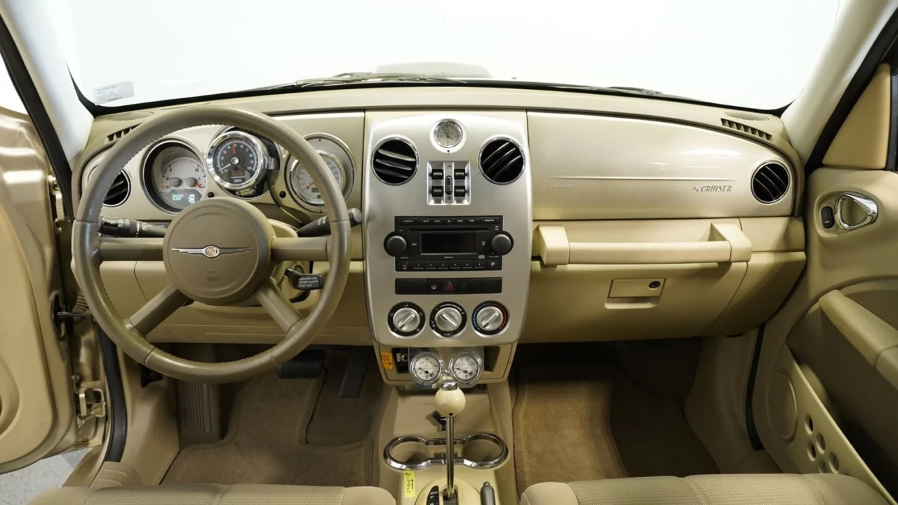 Inside, this PT Cruiser is fairly standard. The Pastel Pebble Beige Atlas Cloth seats are still there. The center stack houses the factory AM/FM/CD radio. The four-spoke steering wheel is connected to power steering. Even the stock automatic shifter remains. But there are some new additions, such as the aftermarket tach, and oil pressure and voltage gauges. (If there was a gauge for how unusual this vehicle is, it would be pegged.)